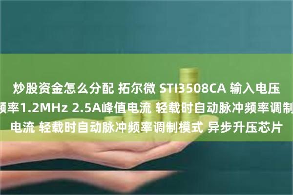 【更多...】深圳市润泽芯电子有限公司 推荐 Tollsemi/拓尔微品牌 STI3508CA SOT23-6封装 炒股资金怎么分配 STI3508CA 输入电压2.5V至5.5V 恒定频率1.2MHz 2.5A峰值电流 轻载时自动脉冲频率调制模式 异步升压芯片 产品描述 STI3508C和STI3508CA是采用SOT23-6封装的峰值电流模式异步升压转换器,适用于小型低功耗应用。 STI3508C和STI3...